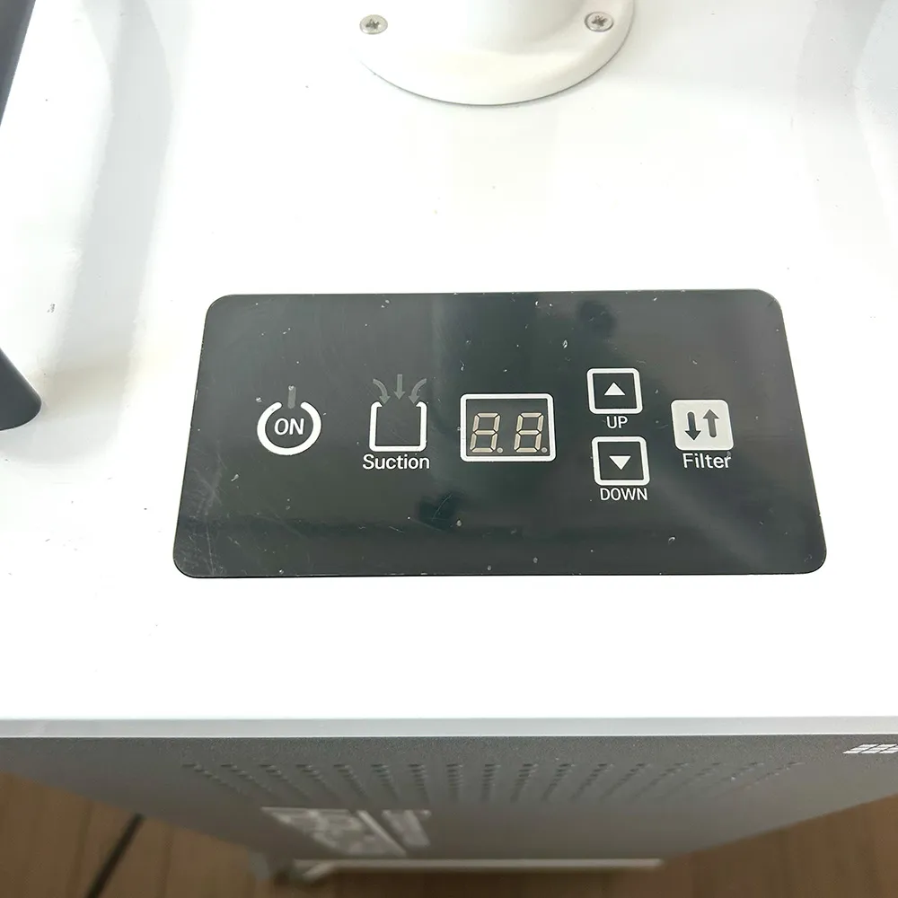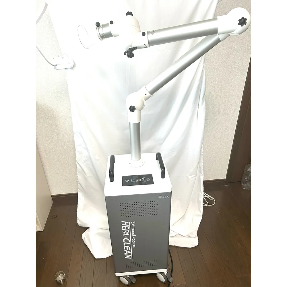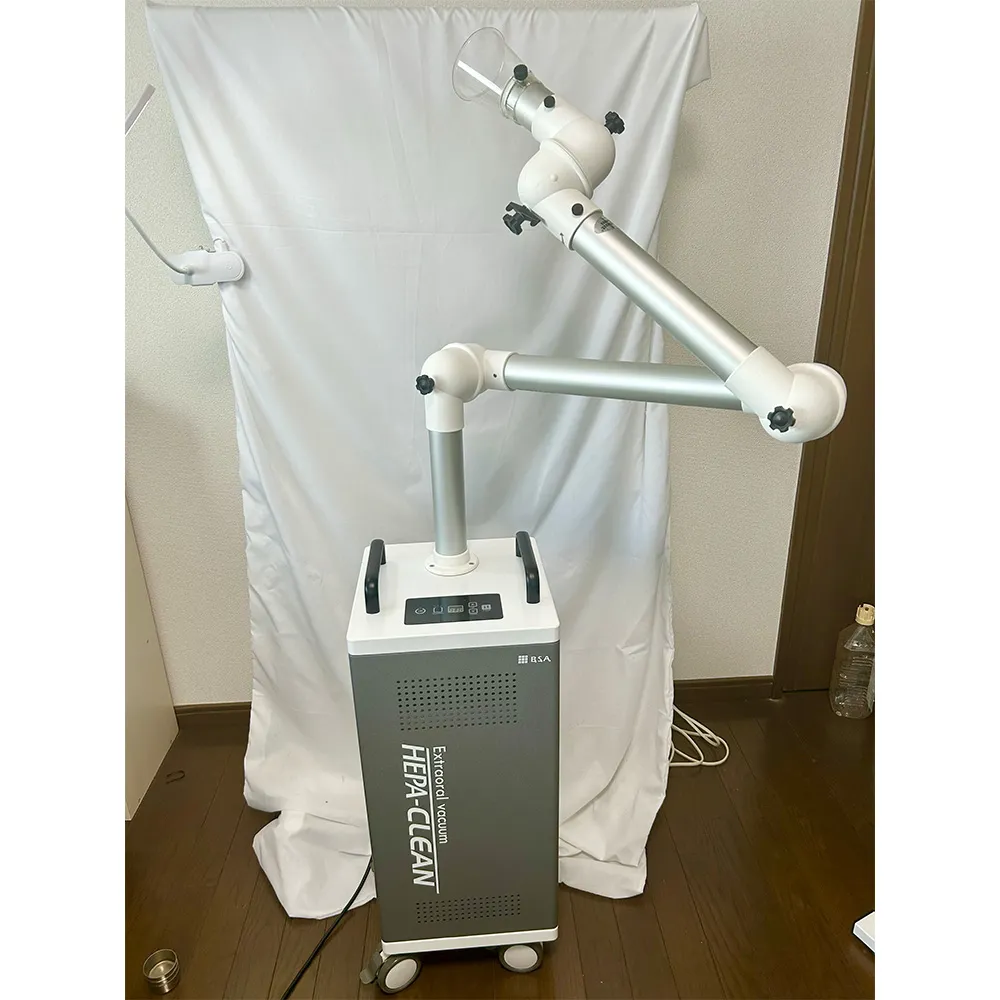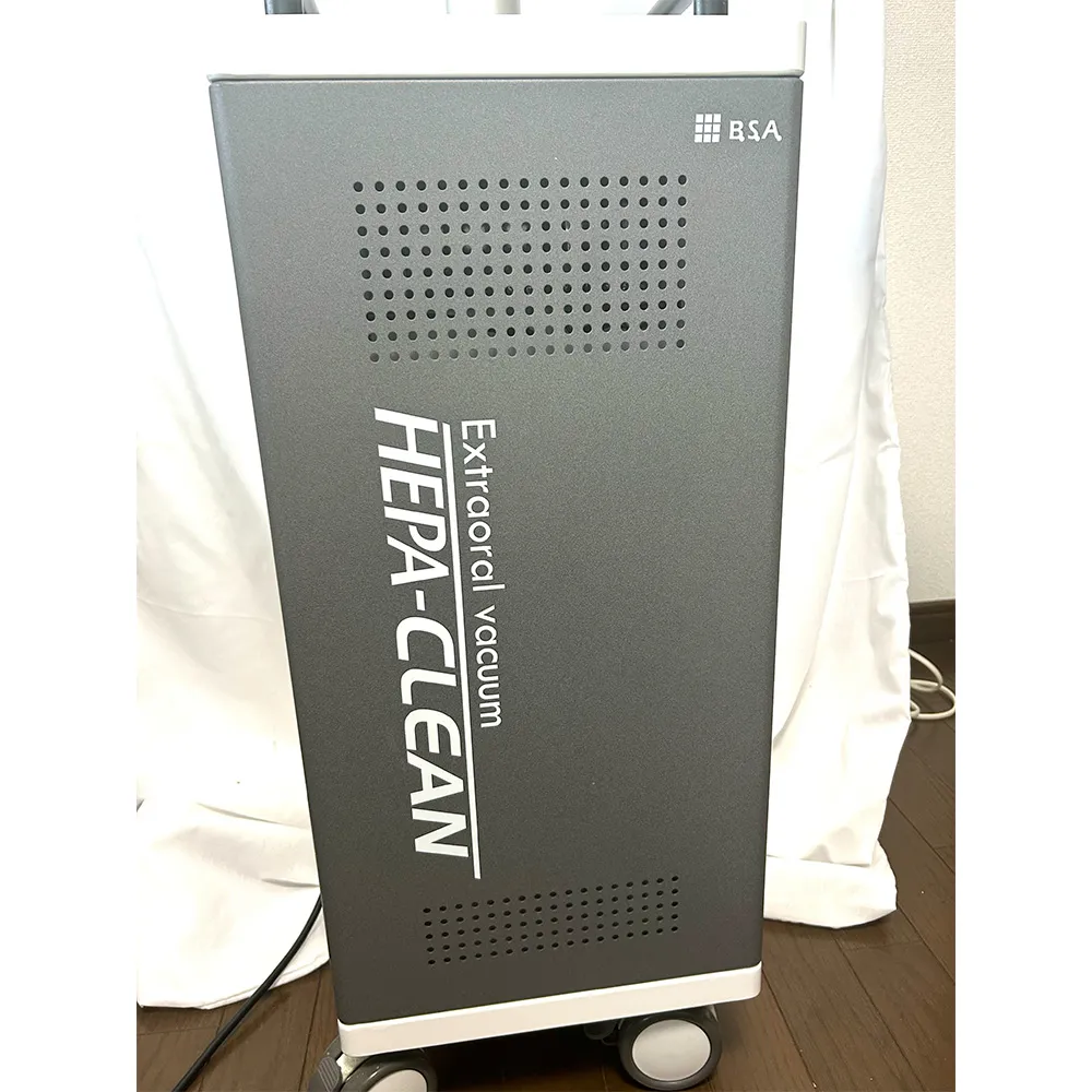 「へパクリーン」は、最大パワー15Kpaの強力吸引と最小55dBの静音設計で、快適な院内環境づくりのお手伝いをします。静電フィルター、高性能へパフィルター、集塵フィルターで3ミクロンの粉塵を99.7%除去します。